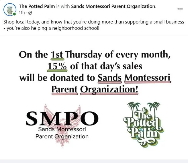 We are so excited and grateful to be partnering with a local business - The Potted Palm! The Potted Palm offers plants and vintage gifts, some even crafted by Sands parents and alumni! It's located right around the corner from Sands in the business district.
